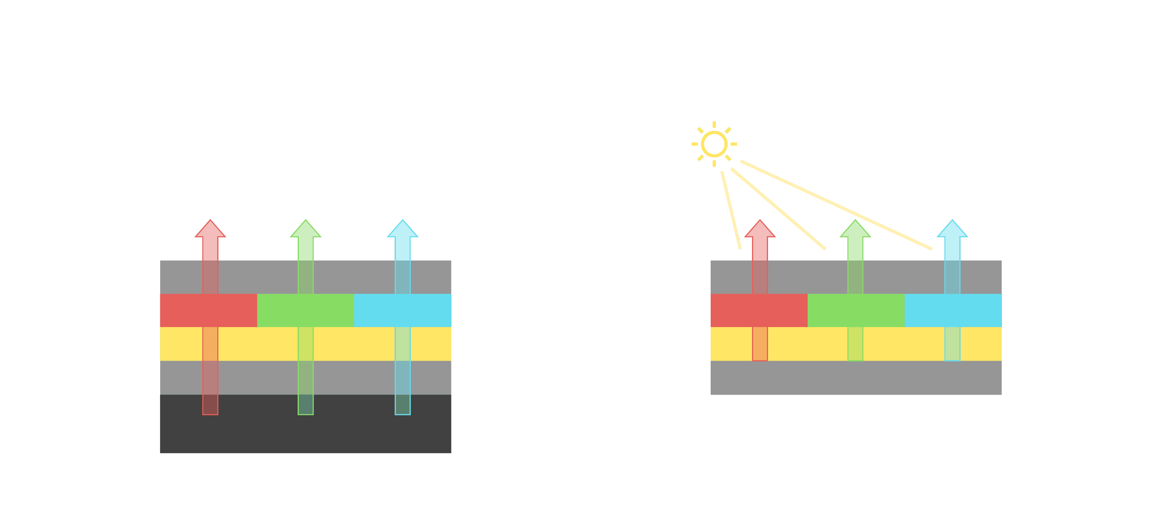 与传统需搭配背光单元的液晶显示相比,,反射式液晶技术不仅更省电、、更轻薄,,,,且即便在艳阳下仍能清晰显示。。。此外,,,少了背光单元,,也大幅降低了 LED 蓝光伤害眼睛的疑虑。。。