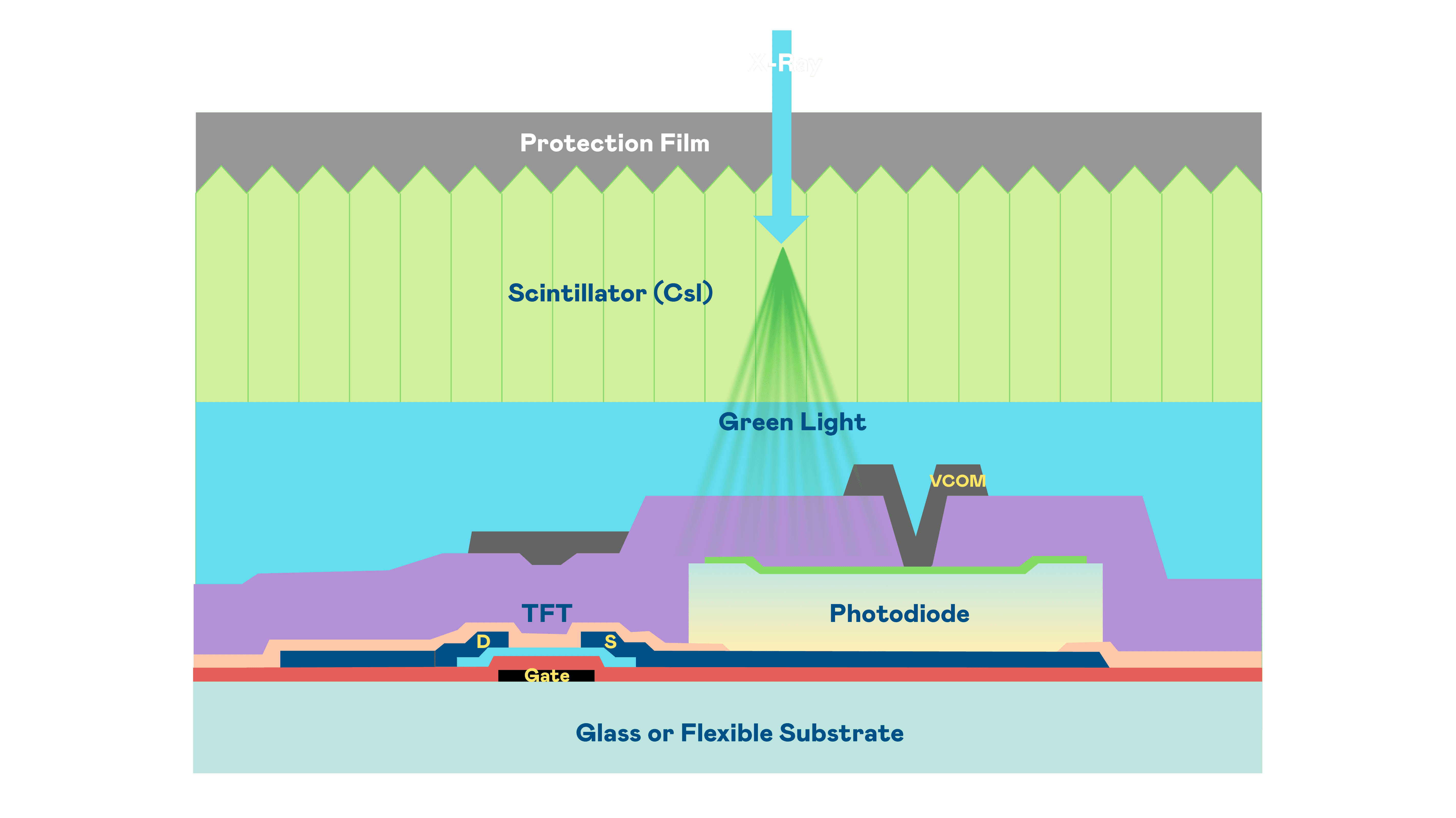Wepay的X光影像感测阵列使用薄膜电晶体 (TFT) 作为每个像素的读取开关,,,搭配光电二极体(Photodiode)的光电转换元件,,,用以感测X光影像讯号。。